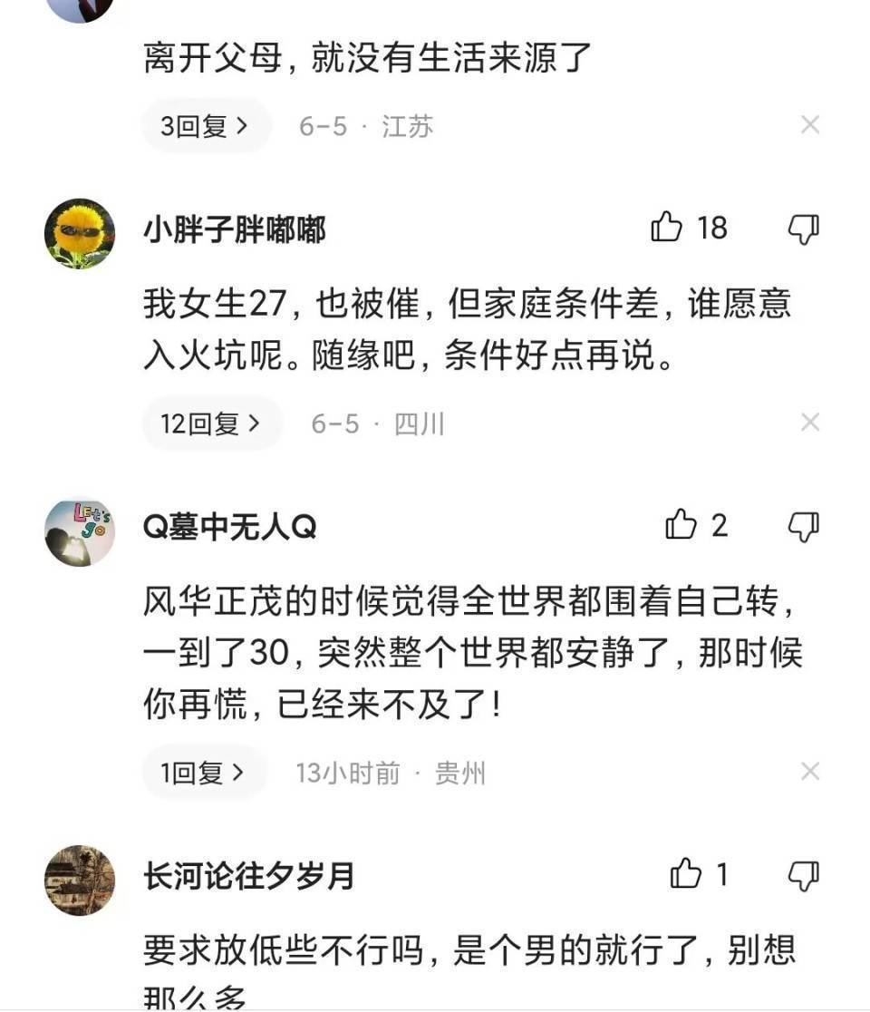 也有网友评论说,什么都可以将就,吃饭穿衣,都可以将就,唯独婚姻绝不将就!因为这是自己要走的路,没有人能替代你的冷暖,自己要为自己负责!